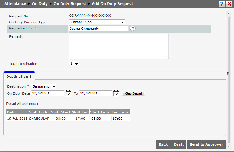 - Destination: Choose the destination from the available option. The available option is configurable in Master Data Setting at on duty destination table.